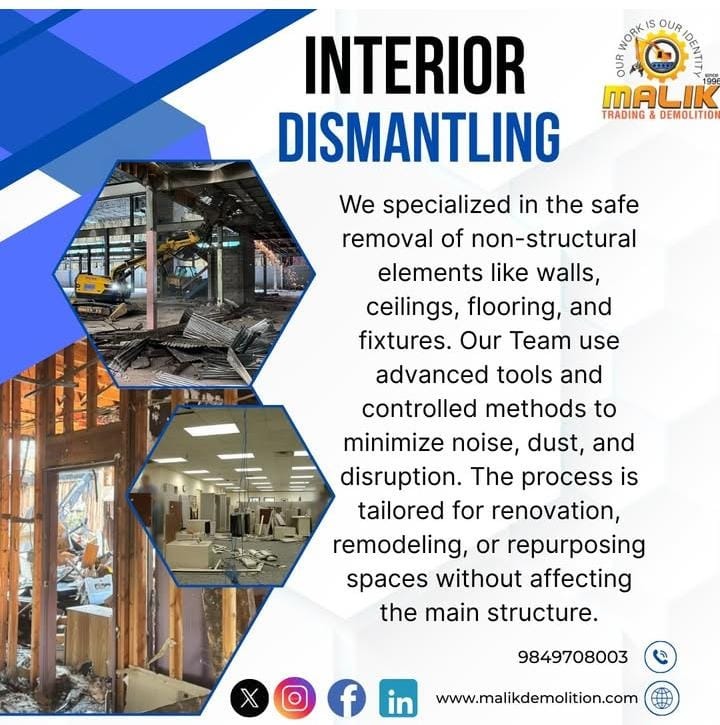 🛠️ **Interior Dismantling Services** 🛠️ We provide professional interior dismantling services carried out with precision, safety, and efficiency. From offices and retail spaces to residential interiors, our experienced team ensures careful removal of partitions, ceilings, flooring, fixtures, and fittings while maintaining a clean and controlled work environment. We focus on timely completion, minimal disruption, and responsible handling of materials to prepare your space for its next phase.
