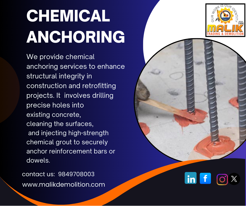 We provide chemical anchoring services to enhance structural integrity in construction and retrofitting projects. It involves drilling precise holes into existing concrete, cleaning the surfaces, and injecting high-strength chemical grout to securely anchor reinforcement bars or dowels.