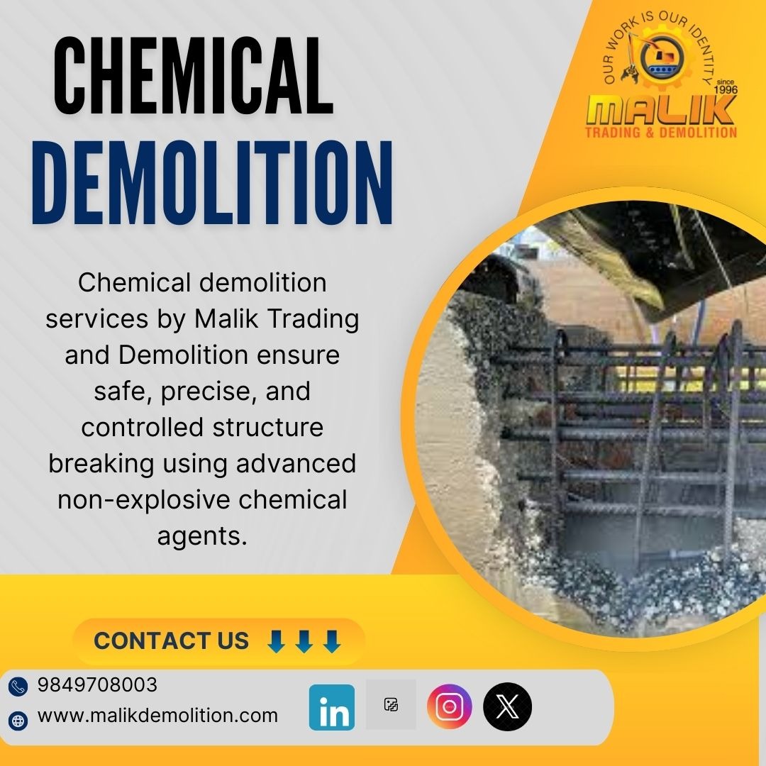 Chemical demolition services by Malik Trading and Demolition ensure safe, precise, and controlled structure breaking using advanced non-explosive chemical agents.