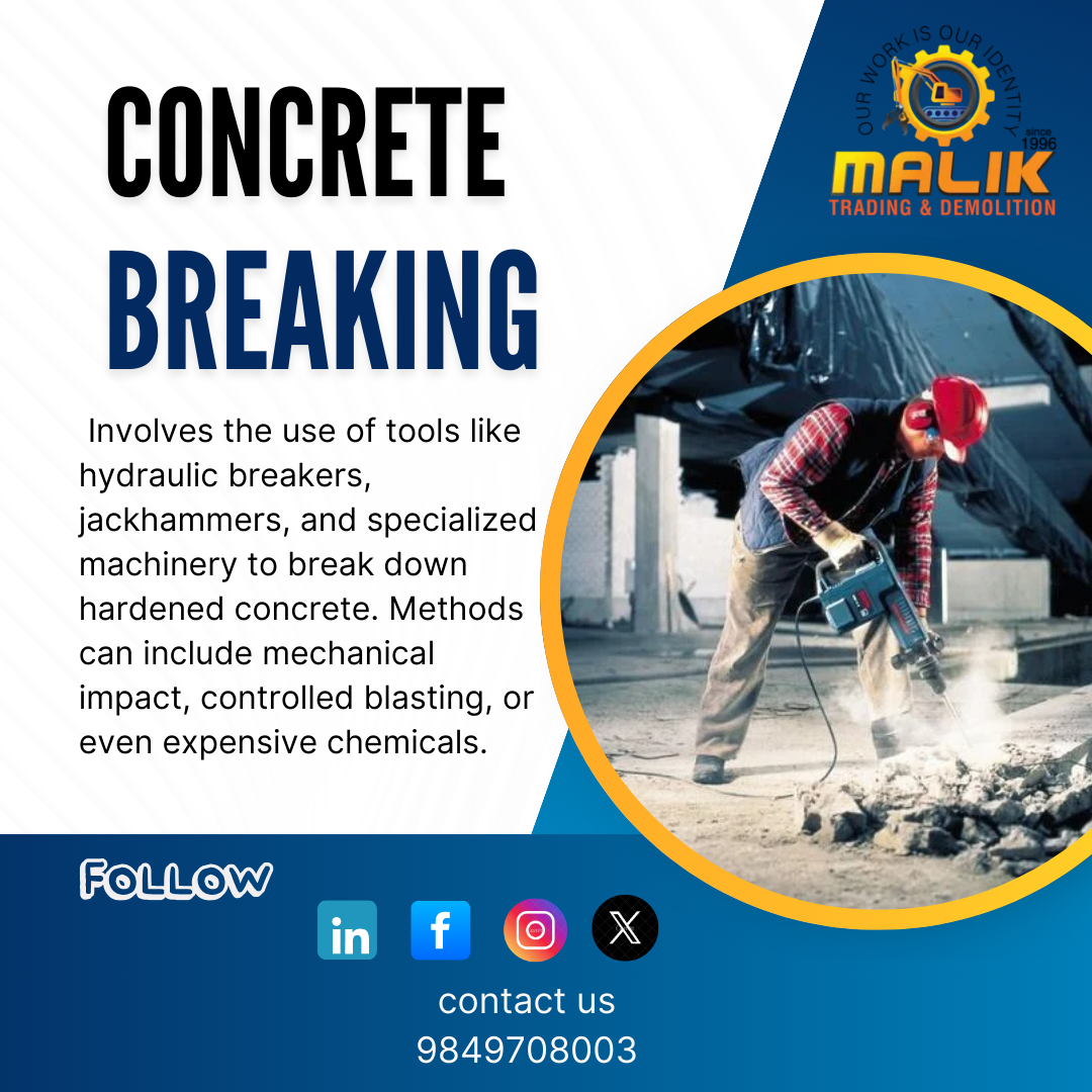Involves the use of tools like hydraulic breakers, jackhammers, and specialized machinery to break down hardened concrete. Methods can include mechanical impact, controlled blasting, or even expensive chemicals.