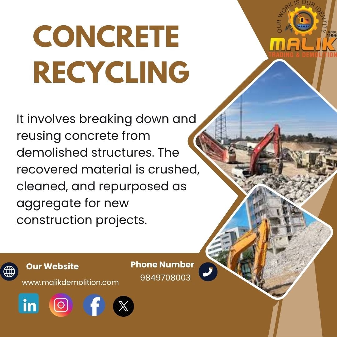 It involves breaking down and reusing concrete from demolished structures. The recovered material is crushed, cleaned, and repurposed as aggregate for new construction projects.