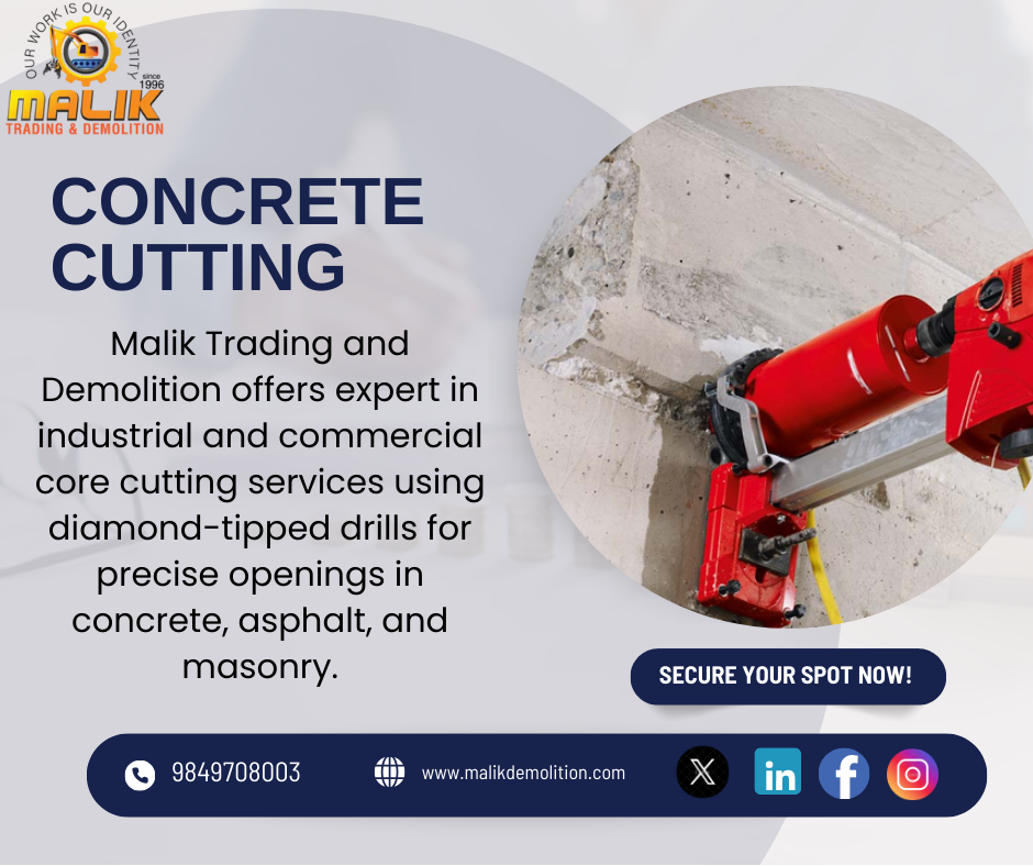 Malik Trading and Demolition offers expert in industrial and commercial core cutting services using diamond-tipped drills for precise openings in concrete, asphalt, and masonry.