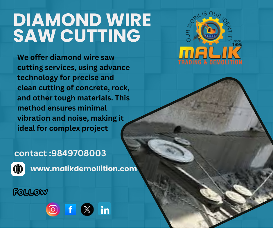 We offer diamond wire saw cutting services, using advance technology for precise and clean cutting of concrete, rock, and other tough materials. This method ensures minimal vibration and noise, making it ideal for complex project.
