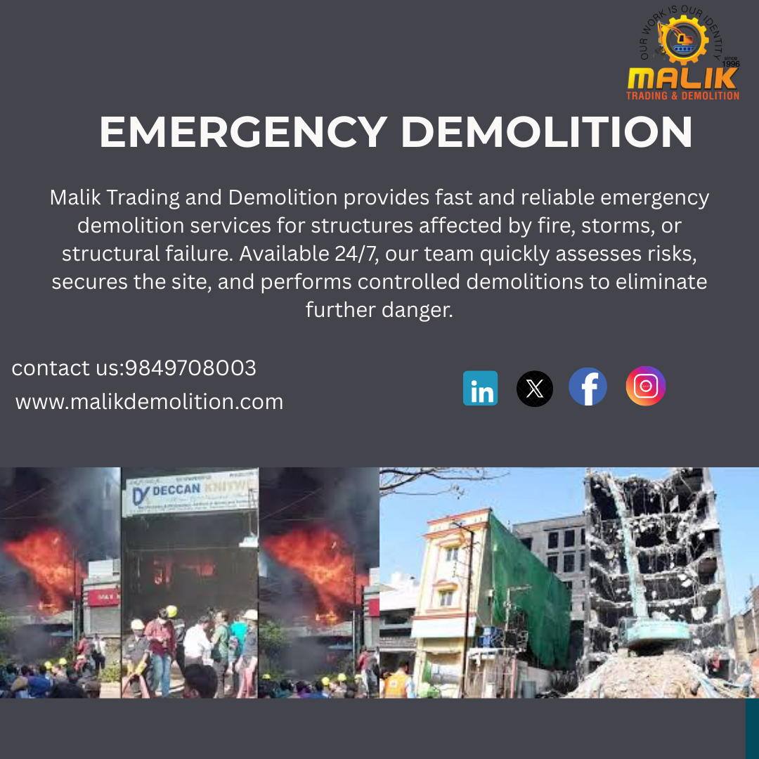 Malik Trading and Demolition provides fast and reliable emergency demolition services for structures affected by fire, storms, or structural failure. Available 24/7, our team quickly assesses risks, secures the site, and performs controlled demolitions to eliminate further danger.