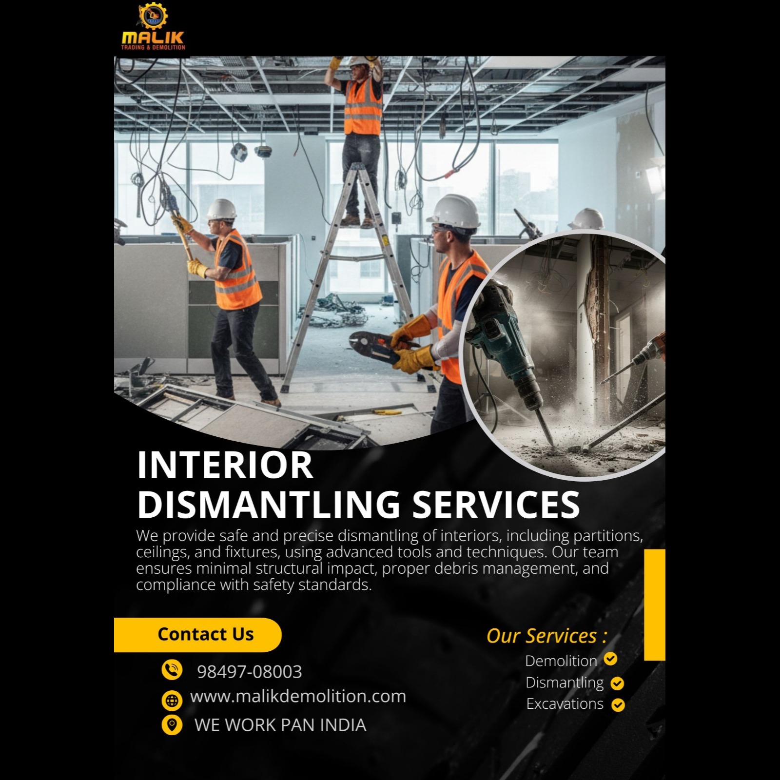 Interior dismantling involves the controlled removal of non-structural components such as partitions, flooring, ceilings, MEP systems, and fixtures within an existing building. The process includes detailed site assessment, isolation of utilities, and selective dismantling using precision tools to avoid structural impact. Dust control, noise management, and waste segregation protocols are strictly followed. Materials are safely removed, documented, and routed for recycling or disposal. This service ensures efficient, clean, and safe preparation of interiors for renovation or repurposing