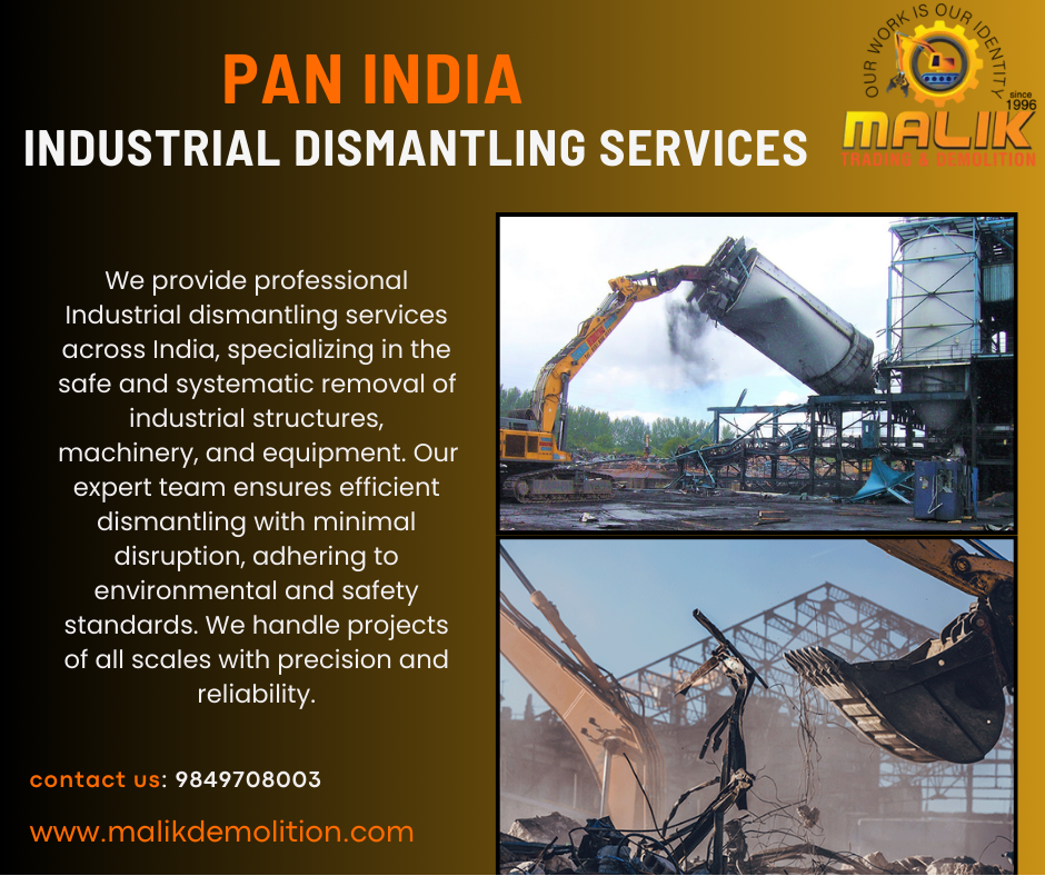 We provide professional Industrial dismantling services across India, specializing in the safe and systematic removal of industrial structures, machinery, and equipment. Our expert team ensures efficient dismantling with minimal disruption, adhering to environmental and safety standards. We handle projects of all scales with precision and reliability.