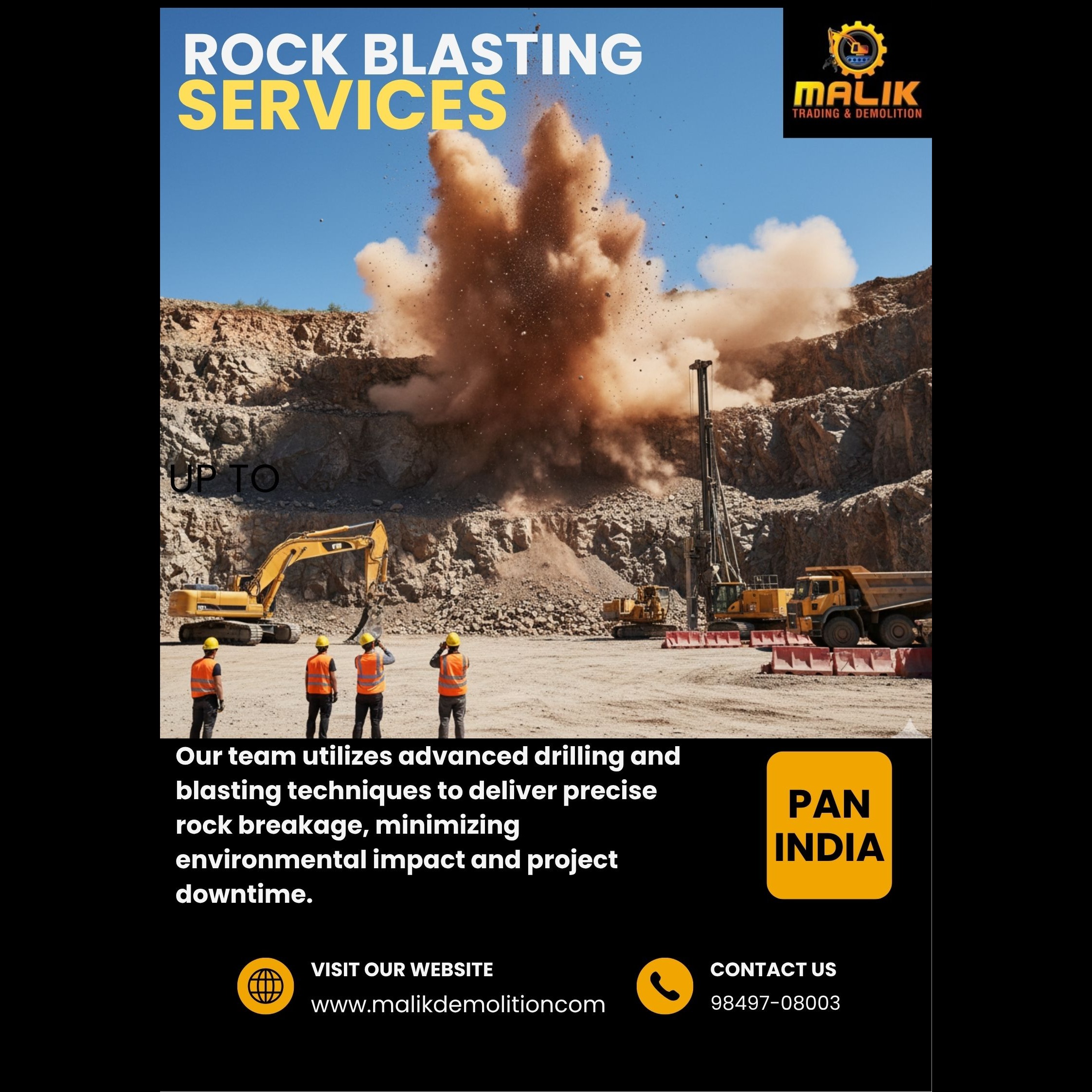 Precision-controlled rock blasting using engineered charge placement and safety protocols. We conduct geological assessments to determine optimal blast patterns and fragmentation levels. Advanced drilling rigs ensure accurate borehole alignment and depth. Vibration control, dust management, and environmental compliance are strictly maintained. Efficient, safe, and high-performance blasting for all terrains.