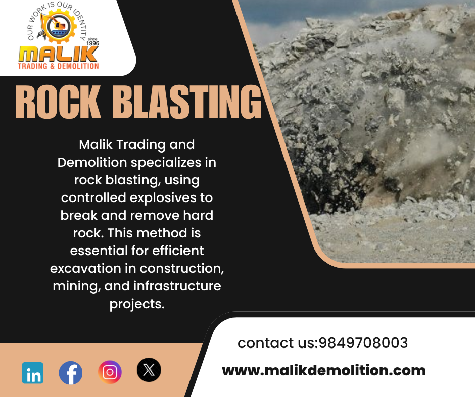 Malik Trading and Demolition specializes in rock blasting, using controlled explosives to break and remove hard rock. This method is essential for efficient excavation in construction, mining, and infrastructure projects.
