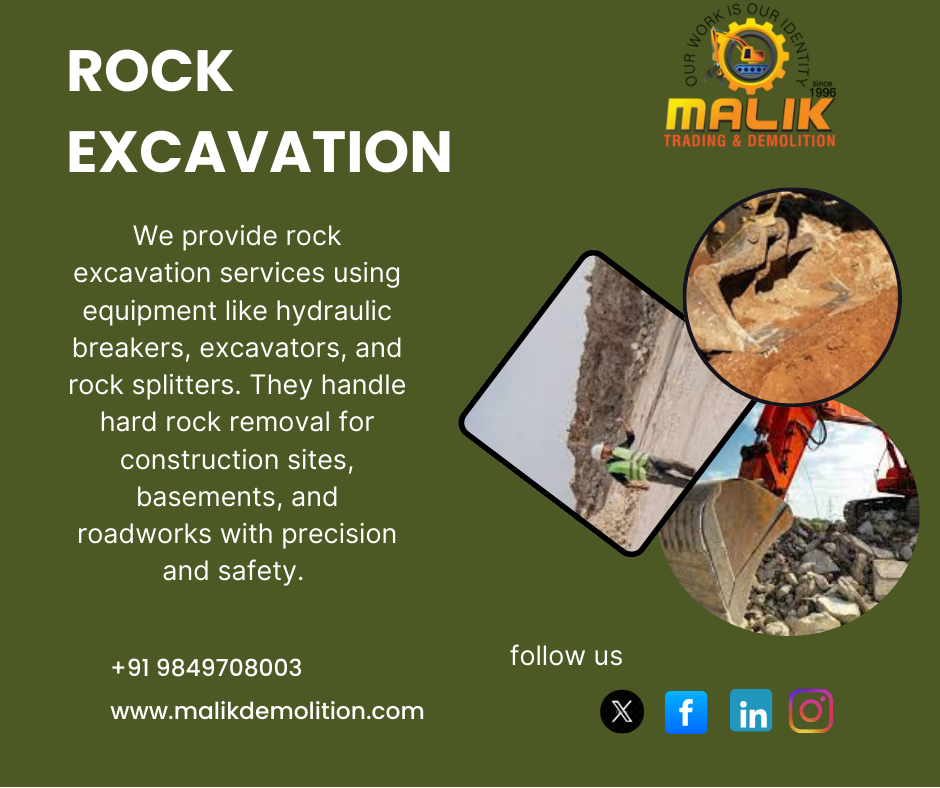 We provide rock excavation services using equipment like hydraulic breakers, excavators, and rock splitters. They handle hard rock removal for construction sites, basements, and roadworks with precision and safety.
