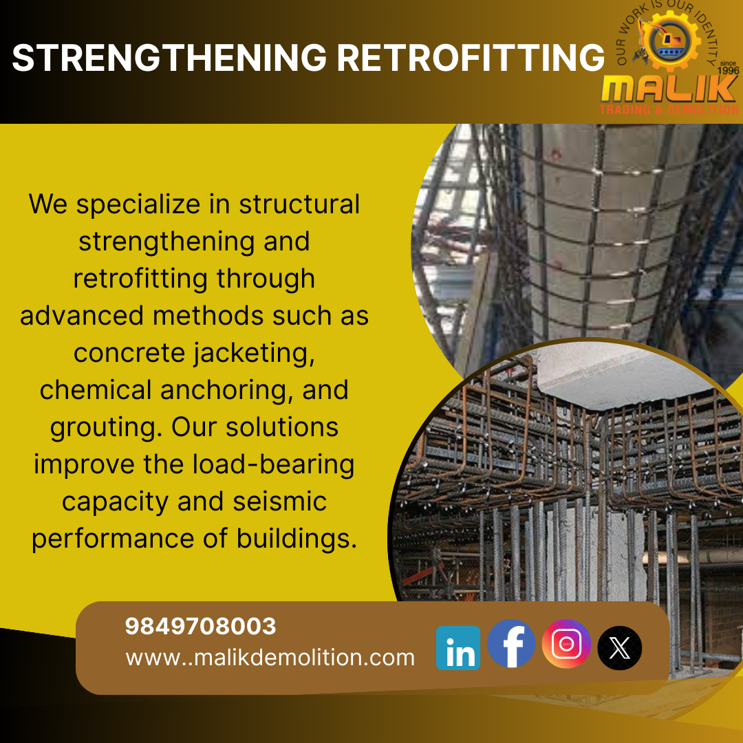 We specialize in structural strengthening and retrofitting through advanced methods such as concrete jacketing, chemical anchoring, and grouting. Our solutions improve the load-bearing capacity and seismic performance of buildings.